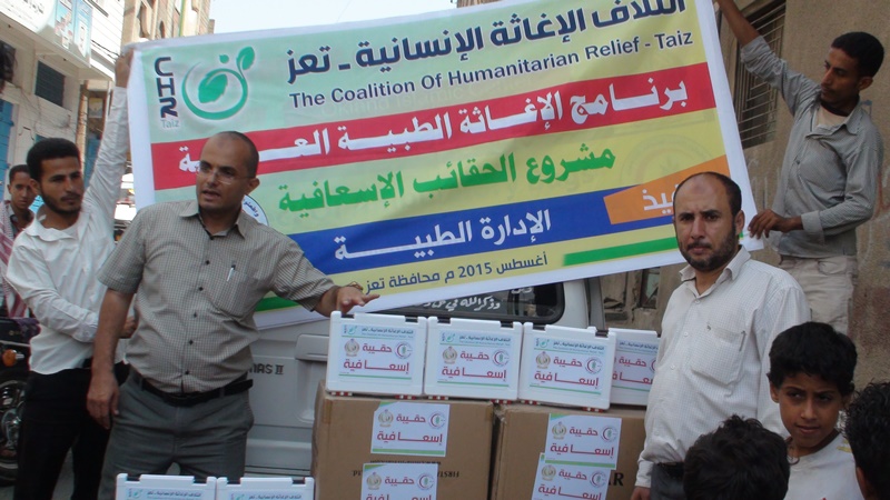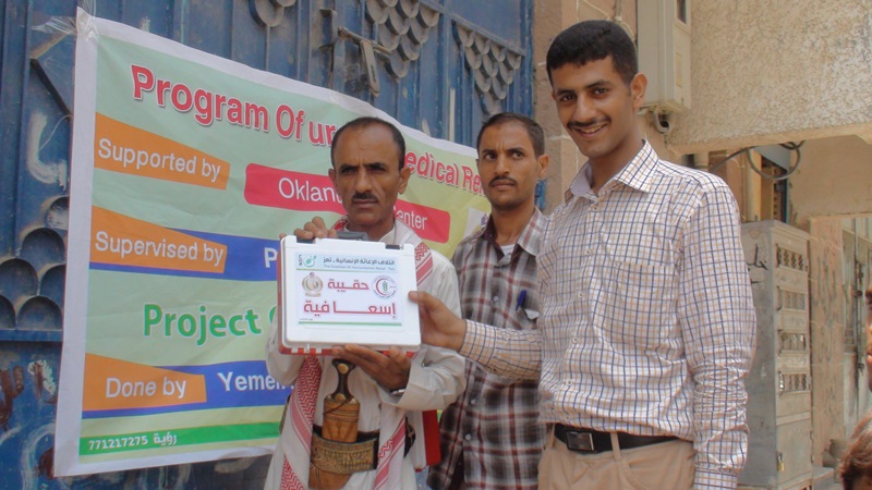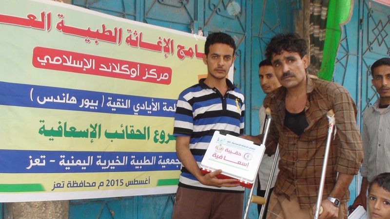 بتمويل من مركز او كلاند الإسلامي وبإشراف منظمة الإيادي النقية، نفذت الجمعية الطبية الخيرية – تعز عضو الإئتلاف وبالتعاون مع الإدارة الطبية في إئتلاف الإغاثة الإنسانية – تعز مشروع توزيع الحقيقة الإسعافية على الأحياء الأكثر تعرضا للقصف العشوائي في مديرية القاهرة ( السعيد – المسبح – حارة عمار – الاعتصام – الشيخ فاضل – الضبوعة ) .
