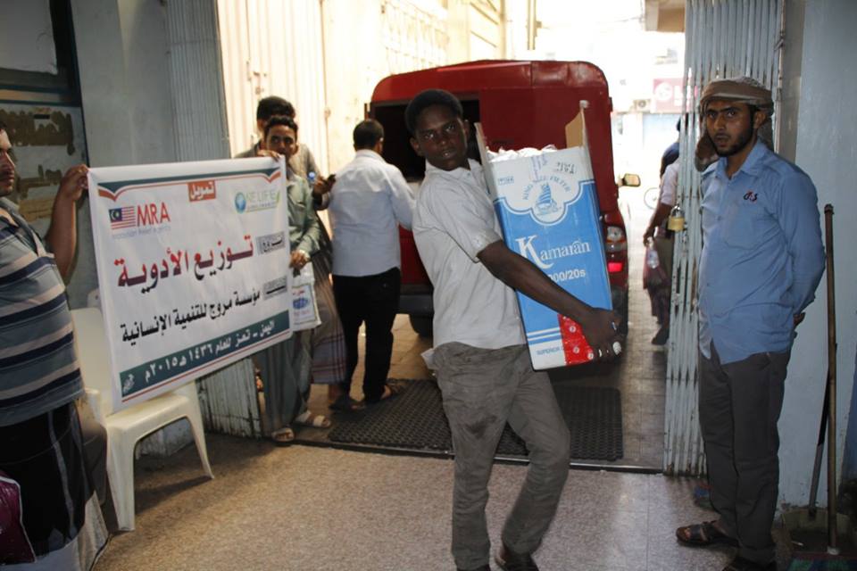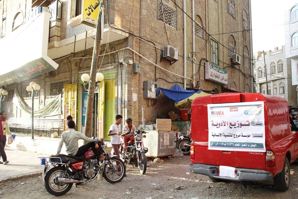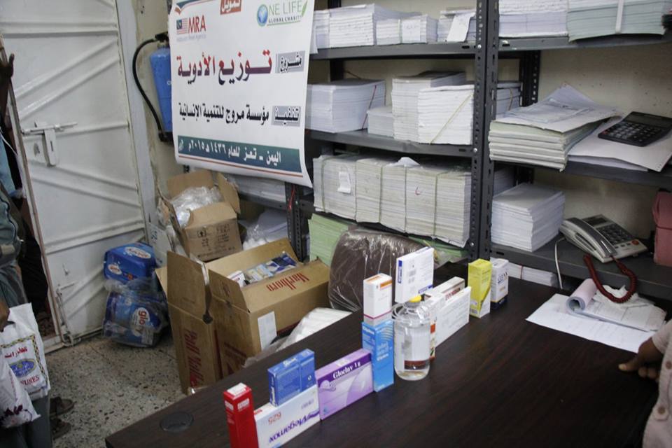 نفذت مؤسسة مروج للتنمية الإنسانية -عضو ائتلاف اللإغاثة الإنسانية – تعز- بتمويل من مؤسسة one life الخيرية العالمية بماليزيا حملة توزيع الأدوية لمستشفيات (الحكمة، الصفوة، الروضة) الواقعة في مناطق الحصار، بقيمة 2 مليون ريال يمني.