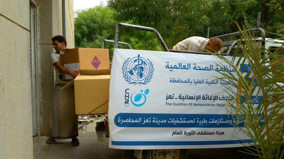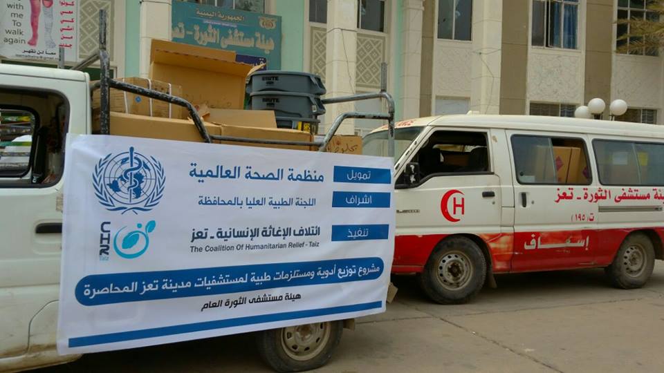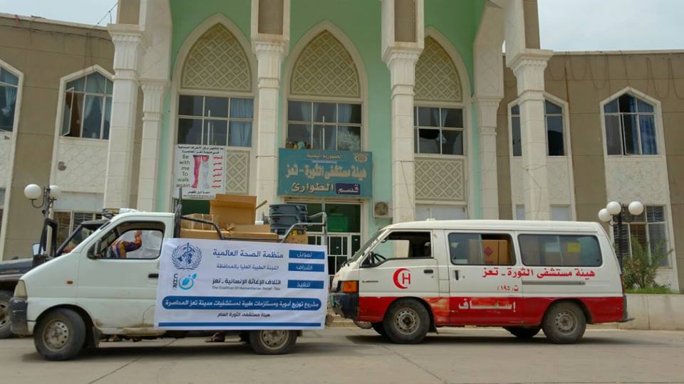 ائتلاف الإغاثة بتعز يوزع مساعدات طبية لمستشفى الثورة من منظمة الصحة العالمية