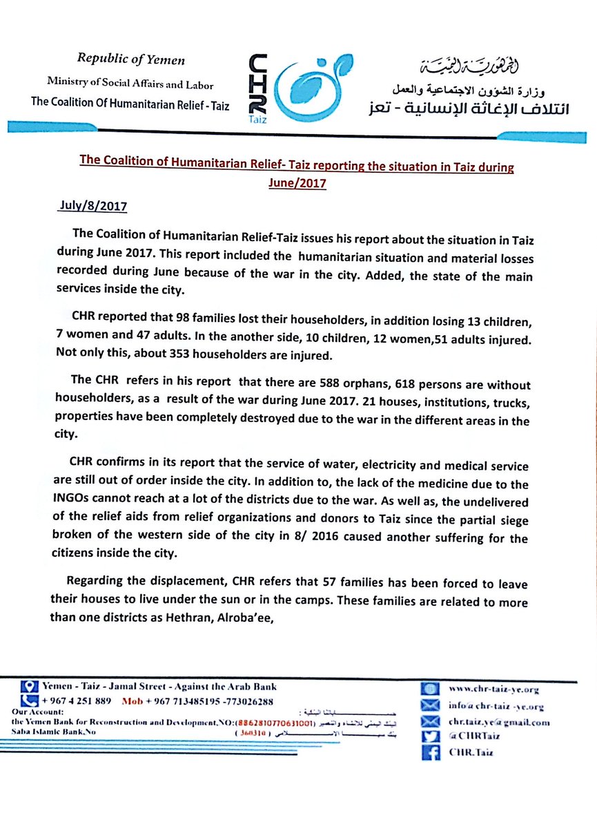 The Coalition of the Humanitarian Relief-Taiz issues his report about the situation in Taiz during June 2017. This report included the humanitarian and material situation and the losses recorded June because of the war in the city. Added, the state of the main services inside the city.