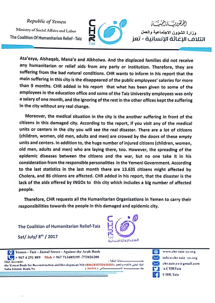 Therefore, CHR requests all the Humanitarian Organizations in Yemen to carry their responsibilities towards the people in this damaged and epidemic city.