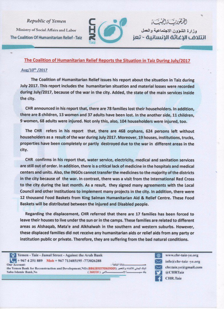 The Coalition of Humanitarian Relief issues his report about the situation in Taiz during July 2017. This report includes the humanitarian situation and material losses were recorded during July/2017, because of the war in the city. Added, the state of the main services inside the city.