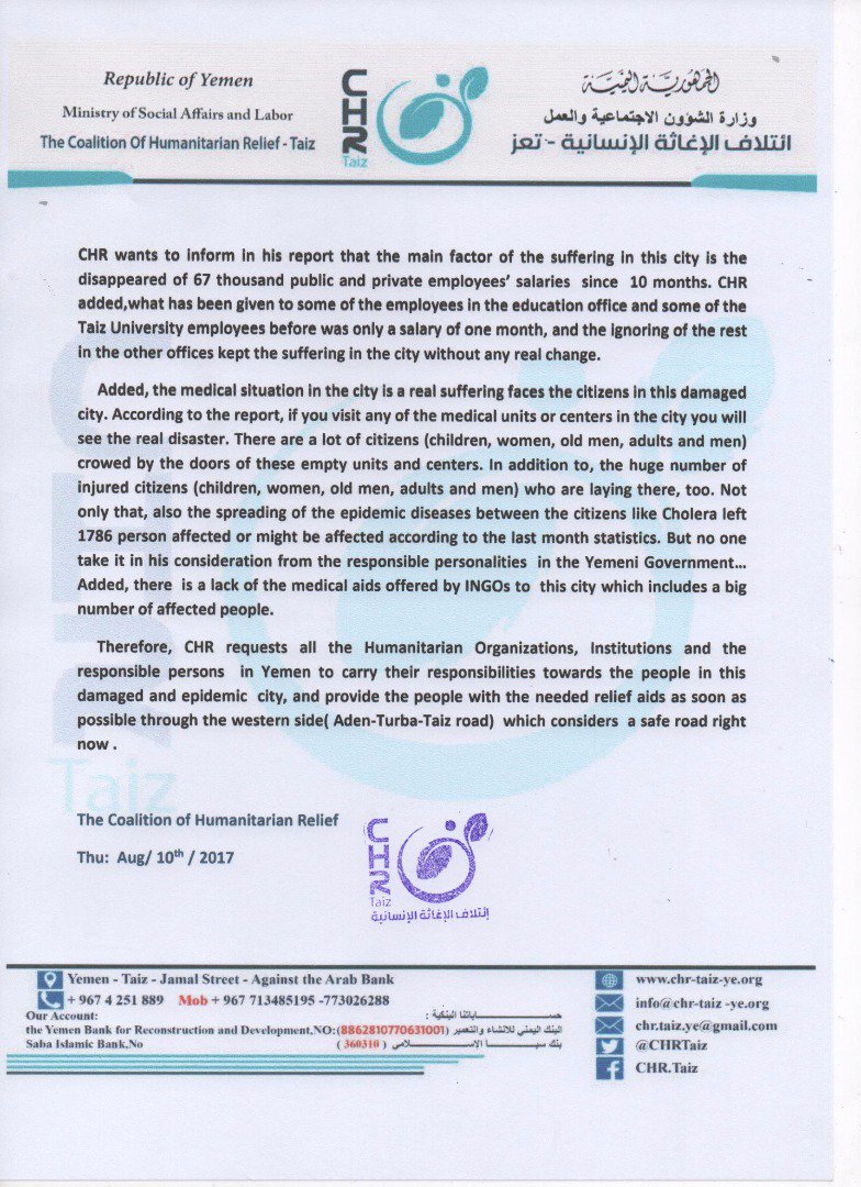 Therefore, CHR requests all the Humanitarian Organizations, Institutions and the responsible persons in Yemen to carry their responsibilities towards the people in this damaged and epidemic city, and provide the people with the needed relief aids as soon as possible through the western side( Aden-Turba-Taiz road) which considers a safe road right now .