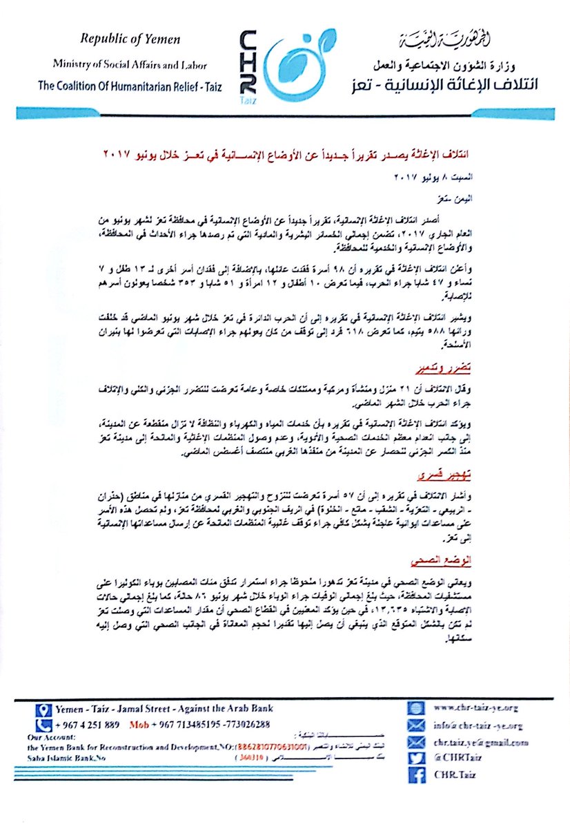 أصدر ائتلاف الإغاثة الإنسانية، تقريراً جديداً عن الأوضاع الإنسانية في محافظة تعز لشهر يونيو من العام الجاري 2017، تضمن إجمالي الخسائر البشرية والمادية التي تم رصدها جراء الأحداث في المحافظة، والأوضاع الإنسانية والخدمية للمحافظة.