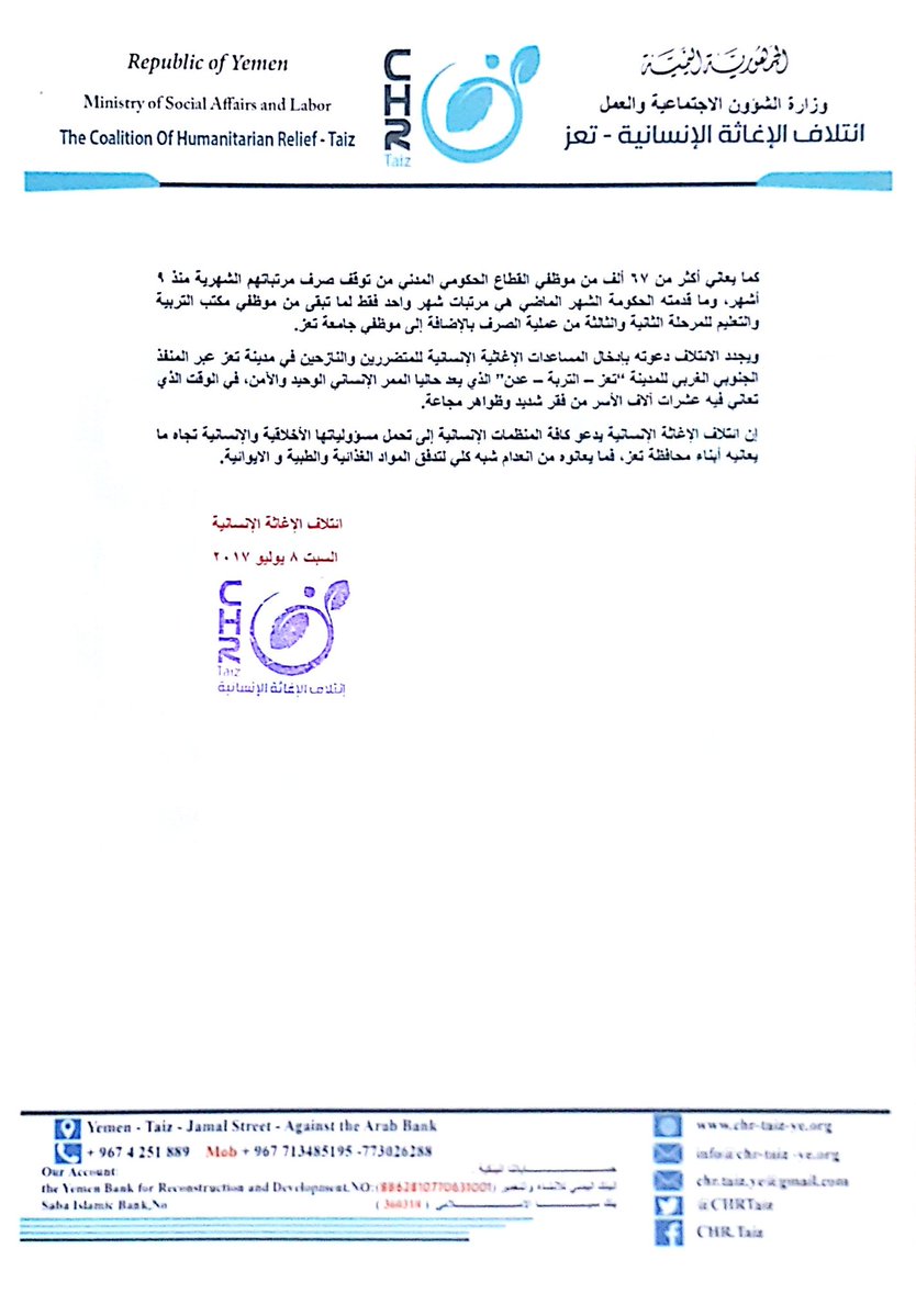 إن ائتلاف الإغاثة الإنسانية يدعو كافة المنظمات الإنسانية إلى تحمل مسؤولياتها الأخلاقية والإنسانية تجاه ما يعانيه أبناء محافظة تعز، فما يعانوه من انعدام شبه كلي لتدفق المواد الغذائية والطبية و الايوائية.
