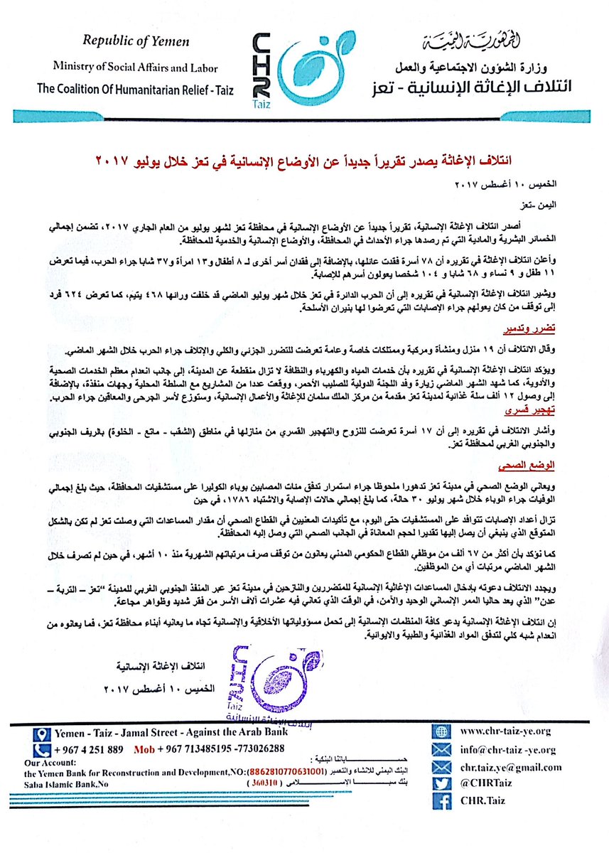 أصدر ائتلاف الإغاثة الإنسانية، تقريراً جديداً عن الأوضاع الإنسانية في محافظة تعز لشهر يوليو من العام الجاري 2017، تضمن إجمالي الخسائر البشرية والمادية التي تم رصدها جراء الأحداث في المحافظة، والأوضاع الإنسانية والخدمية للمحافظة.